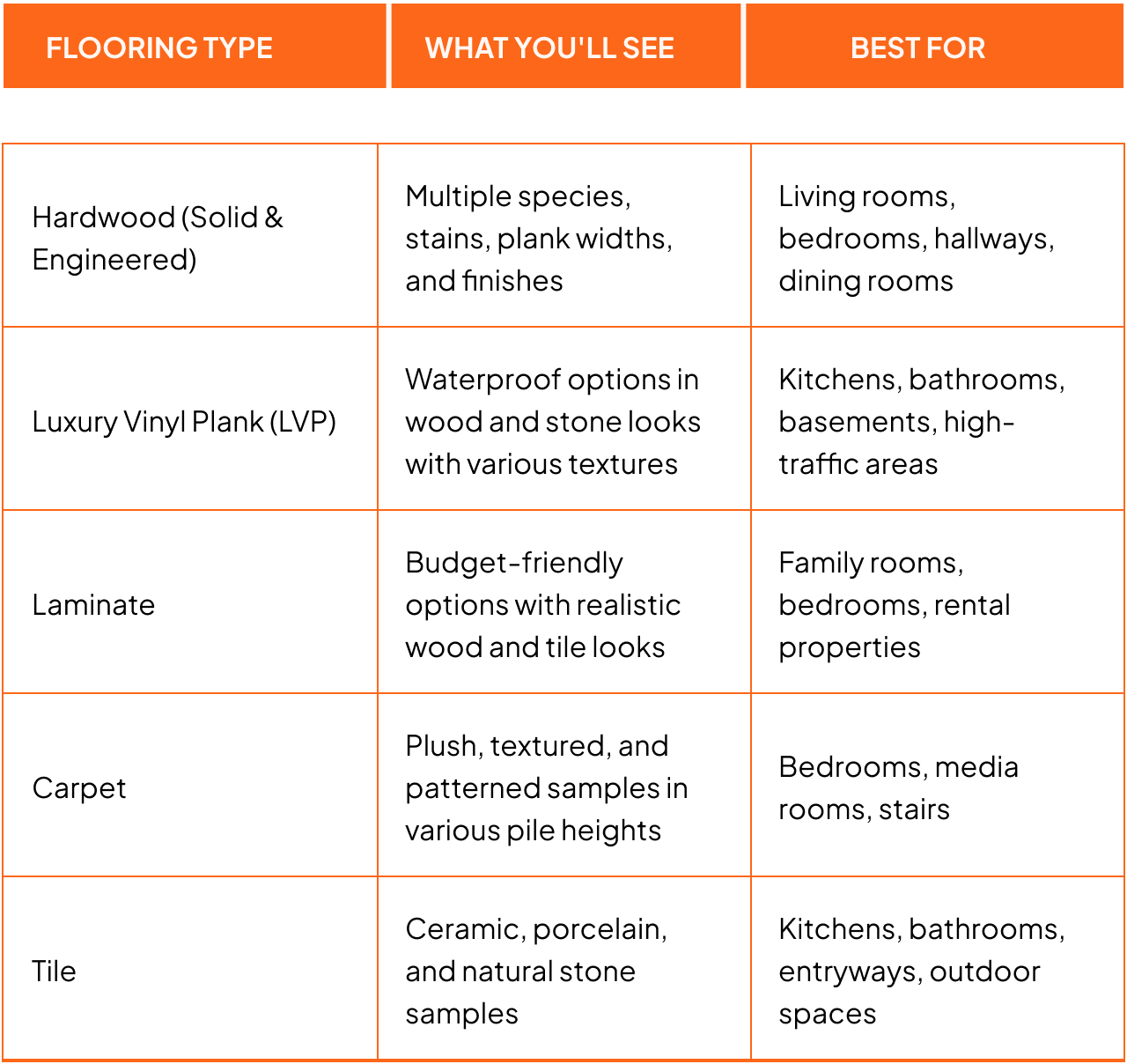 Our specialist will help you narrow down options based on your style, your rooms, your lifestyle (kids? pets? high traffic?), and your budget. We'll recommend the best materials for each specific space.