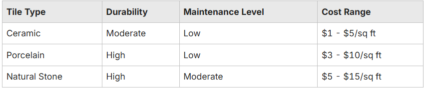 This comparison highlights the differences in durability, maintenance, and cost between various tile types, helping homeowners make informed decisions based on their needs and budget.